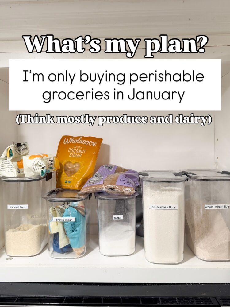 I’m only buying perishable groceries in January. Think mostly produce and dairy. Everything else? We’re shopping our pantry and freezer first. Snacks. Staples. Random boxes I forgot existed.