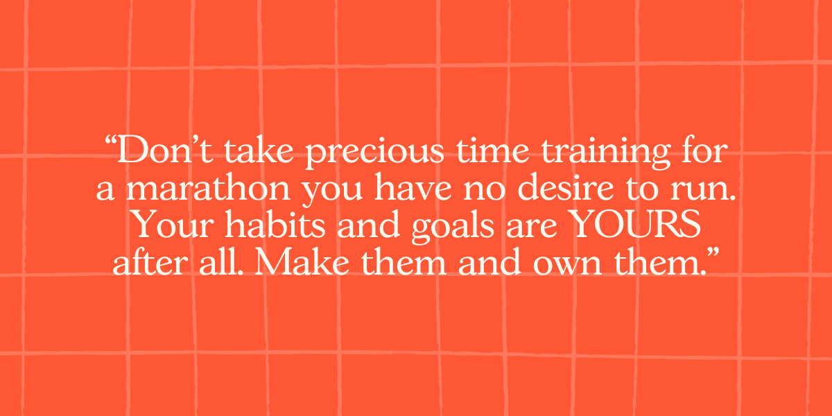And if the answer is no, you don’t need to feel an ounce of guilt that you aren’t partaking. Just because a large group of people is doing something does not make it right for you! Don’t take precious time training for a marathon you have no desire to run. Your habits and goals are YOURS after all. Make them and own them.