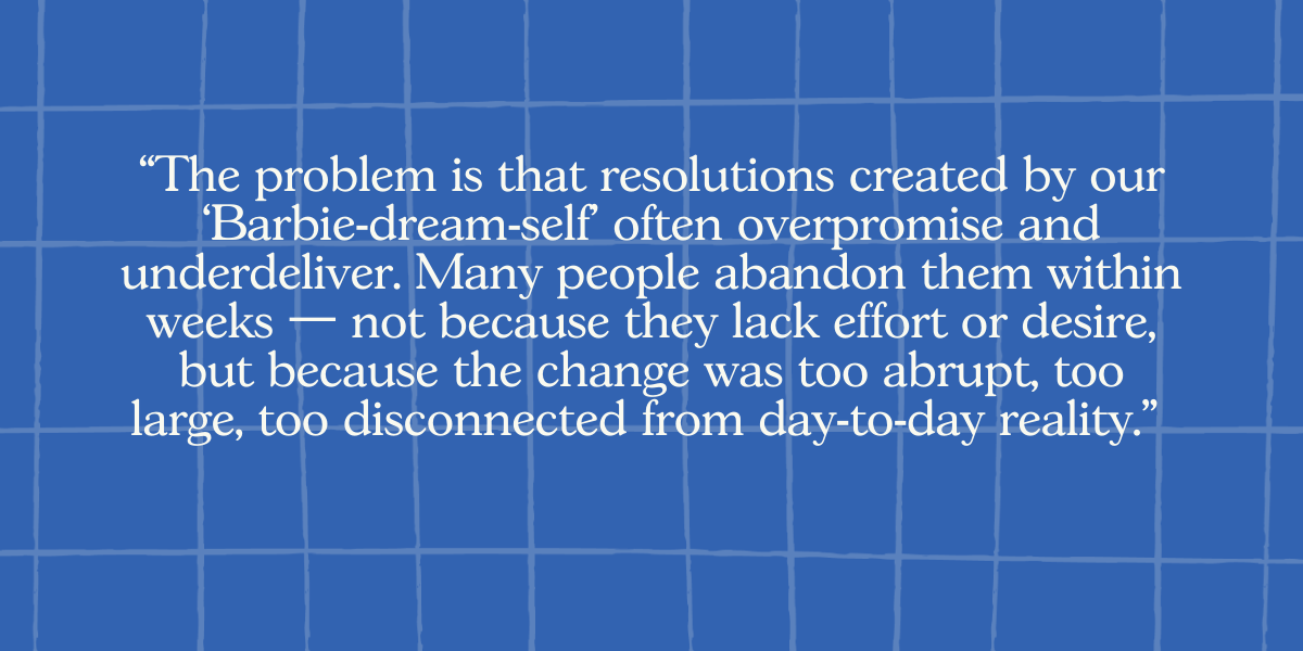 The problem is that resolutions created by our ‘Barbie-dream-self’ often overpromise and underdeliver. Many people abandon them within weeks — not because they lack effort or desire, but because the change was too abrupt, too large, too disconnected from day-to-day reality.