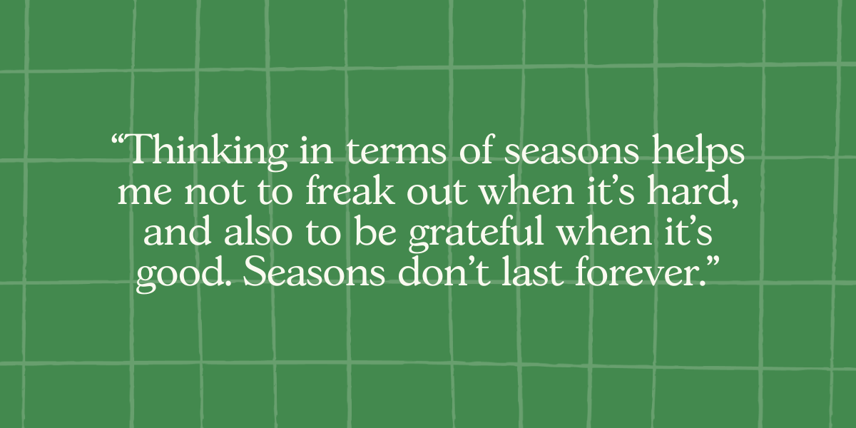 Thinking in terms of seasons helps me to not freak out when it’s hard, and also to be grateful when it’s good. Seasons don’t last forever.